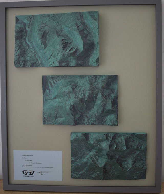 A triptych piece showing the iconic British Three Peaks, Ben Nevis, Scafell Pike, and Yr Wyddfa (Snowdon).